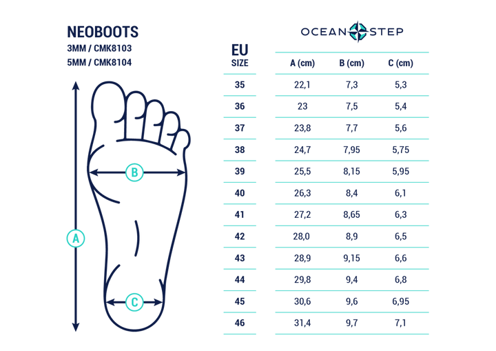 Les combinaisons et accessoires en néoprène OCEAN STEP sont disponibles dans une variété de tailles. Vous trouverez ci-dessous, nos guides des tailles (métrique) concernant l'ajustement de nos produits.
